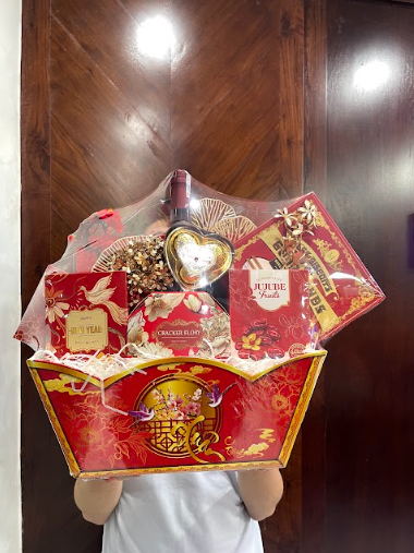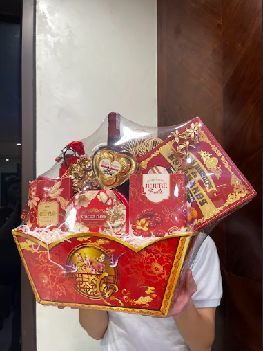 Giỏ quà Tết cao cấp Tiệm Gói Ghém được thiết kế nổi bật với tông đỏ – vàng truyền thống, tượng trưng cho tài lộc, thịnh vượng và niềm vui đoàn viên ngày Xuân.